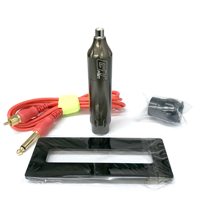 Rotativa GT6, fabricada por AVA; máquina tipo PEN para agujas de cartuchos. Es verdaderamente fuerte aun trabajando a baja tensión. Incluye un segundo grip intercambiable de 30mm, bandeja expositora para la maquina y cable RCA de regalo.