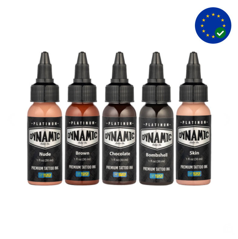 Flesh de la gama Dynamic Colors Co Platinum es una colección de 5 tintas de tatuaje de tono de piel. El conjunto Flesh contiene: