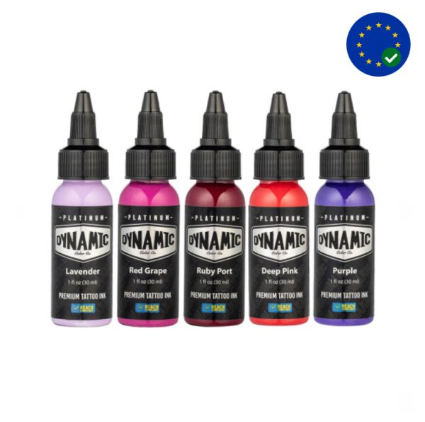 Lush de la gama Dynamic Colors Co Platinum es una colección de 5 tintas para tatuajes en tonos morados y rojos. El conjunto Lush contiene: